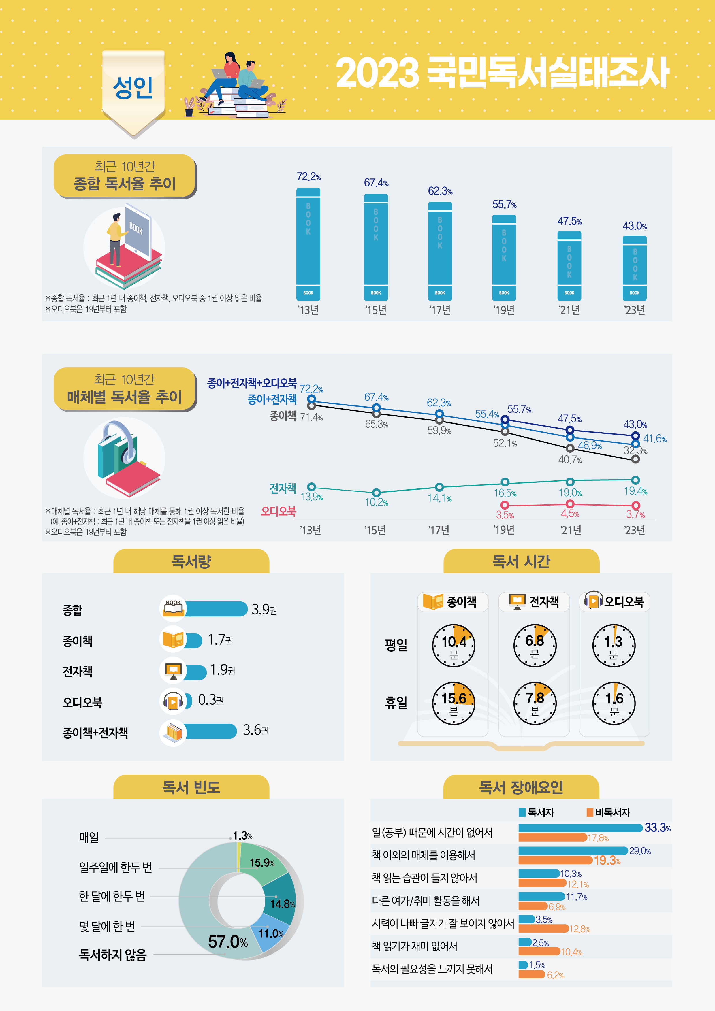 문체부에서 발표한 2023 독서량 통계, 국민독서실태조사를 보고 간략히 줄인 내용들입니다.