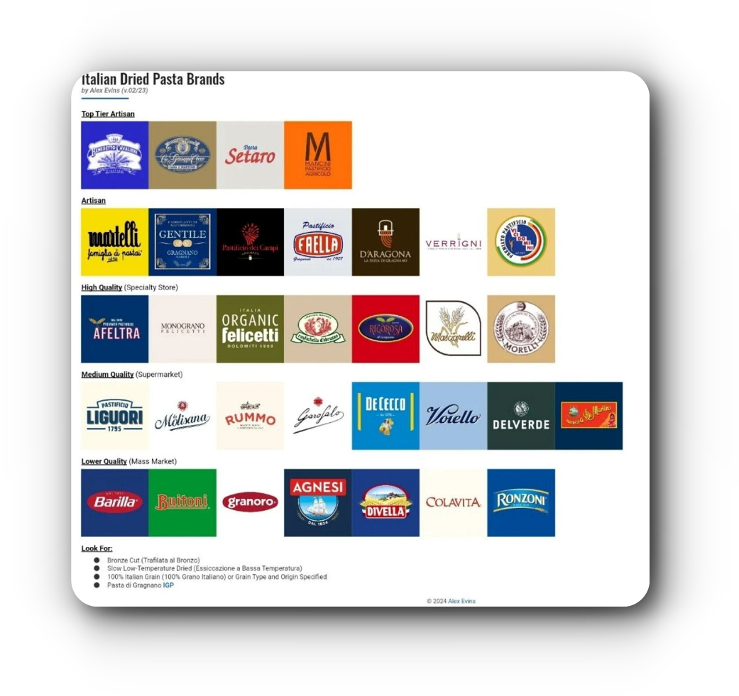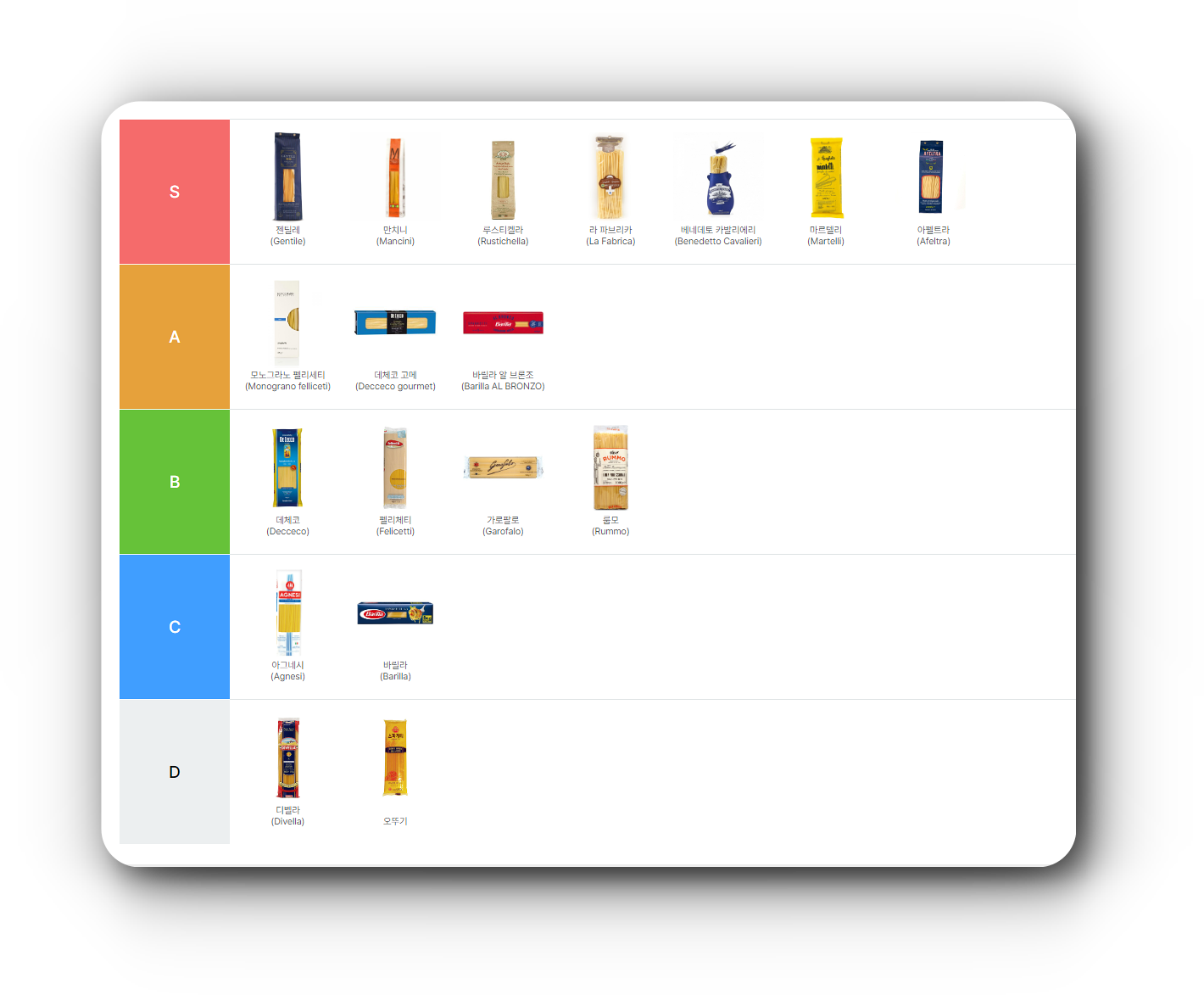 | D등급 | 바릴라 (Barilla), 부이토니 (Buitoni), 그라노로 (Granoro), 아그네시 (Agnesi), 디벨라 (Divella), 콜라비타 (Colavita), 론조니 (Ronzoni) |