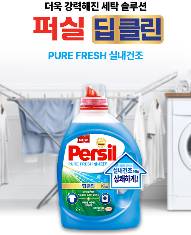- 퍼실 딥클린 실내건조: 외국 브랜드인 퍼실의 실내건조 전용 세제로, 쉰내를 확실하게 잡아주는 제품이에요.