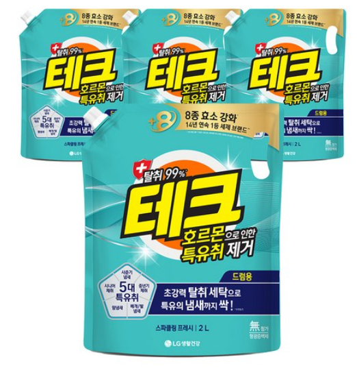 - 테크 호르몬 특유취 제거: 국산 제품 중 특유의 냄새를 잘 잡아주는 세제에요. 남성 특유의 땀 냄새와 실내건조에서 발생할 수 있는 쉰내를 방지해줍니다.