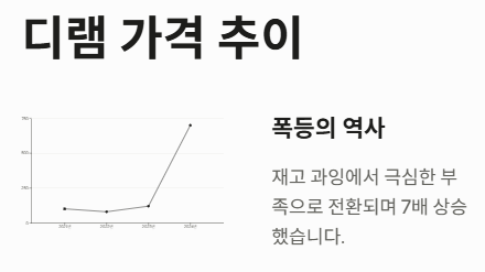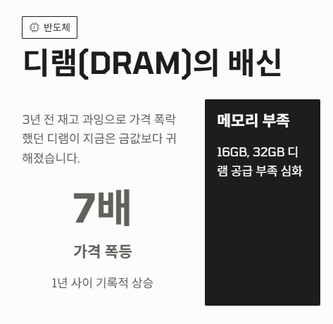 | 부품 시세 | 디램(DRAM) 가격이 1년 새 7배 이상 폭등 | 2027년 안정 기대 |