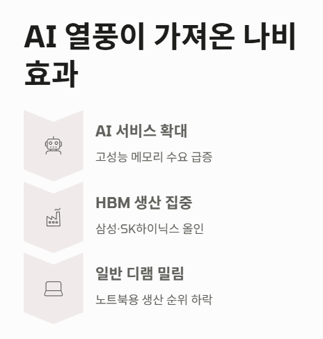 | 핵심 원인 | AI 열풍으로 인한 HBM 생산 집중 및 일반 디램 부족 | 공급 부족 장기화 |