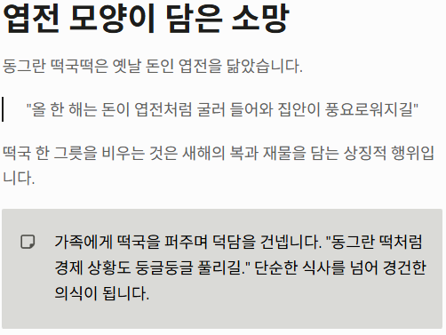 이번 설날, 가족과 함께 둘러앉아 떡국을 드실 때 "이건 엽전 모양이라 재물복을 준대요" 혹은 "흰색이라 새 출발을 의미한대요" 같은 작은 이야기를 나누어 보세요. 아마 그 떡국 맛이 평소보다 훨씬 더 고소하고 따뜻하게 느껴지실 거예요. 여러분 모두 떡국 맛있게 드시고, 새해 복 많이 받으세요!